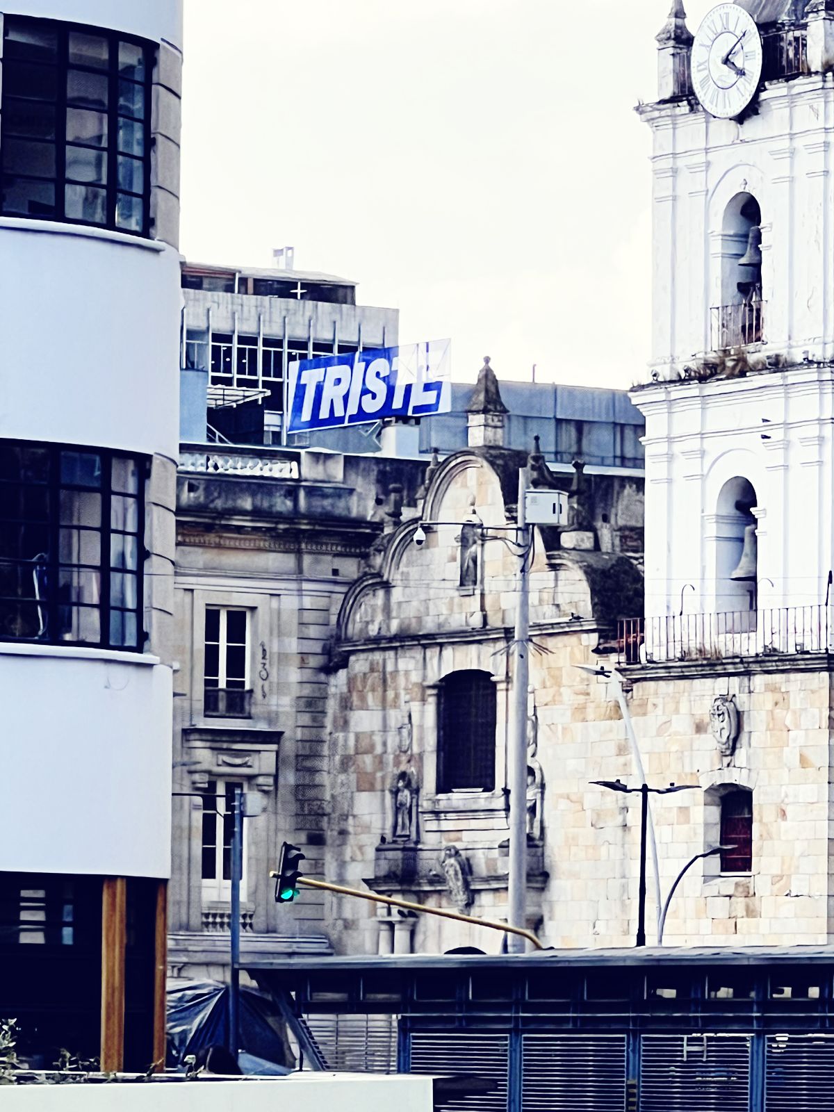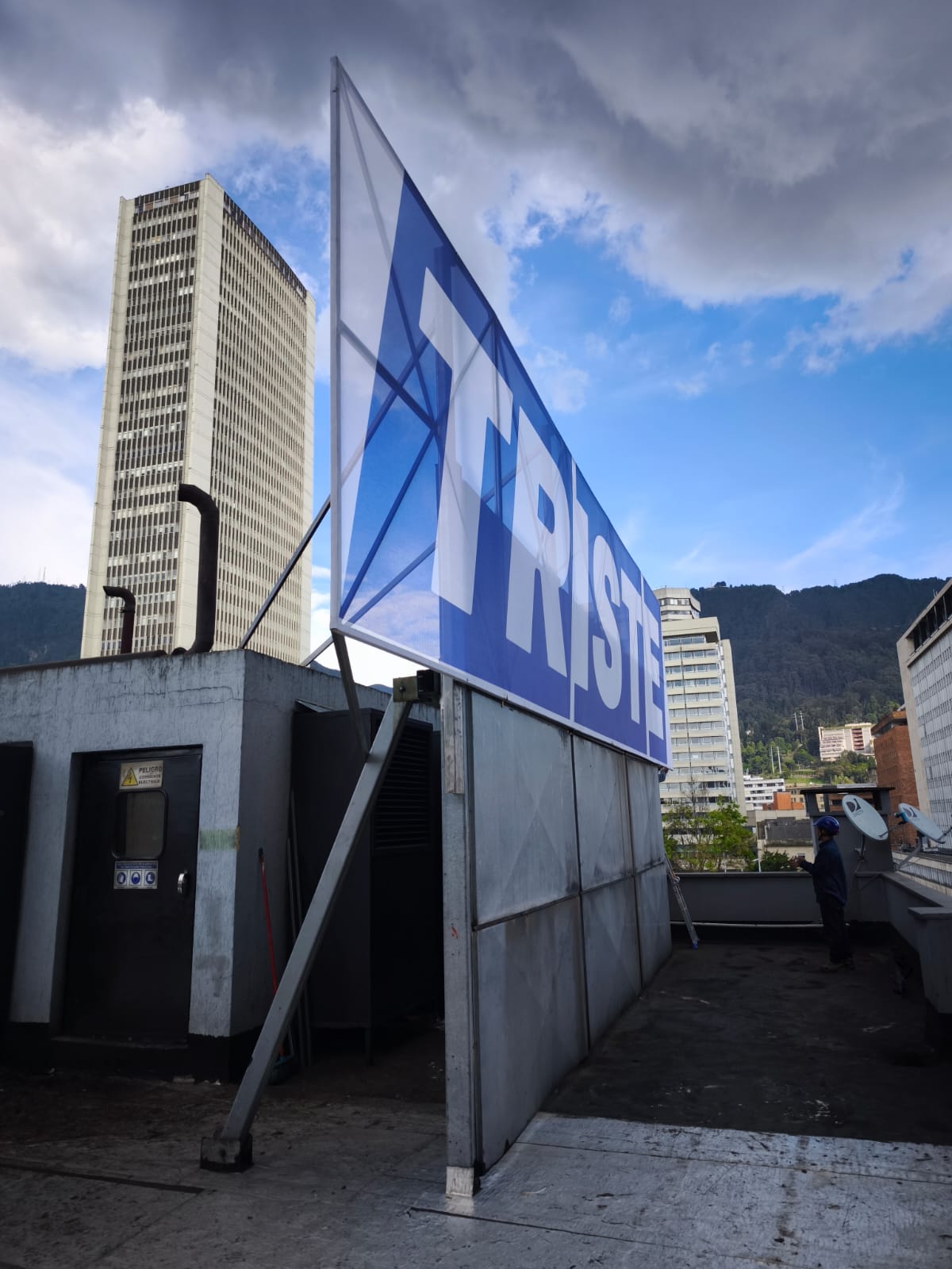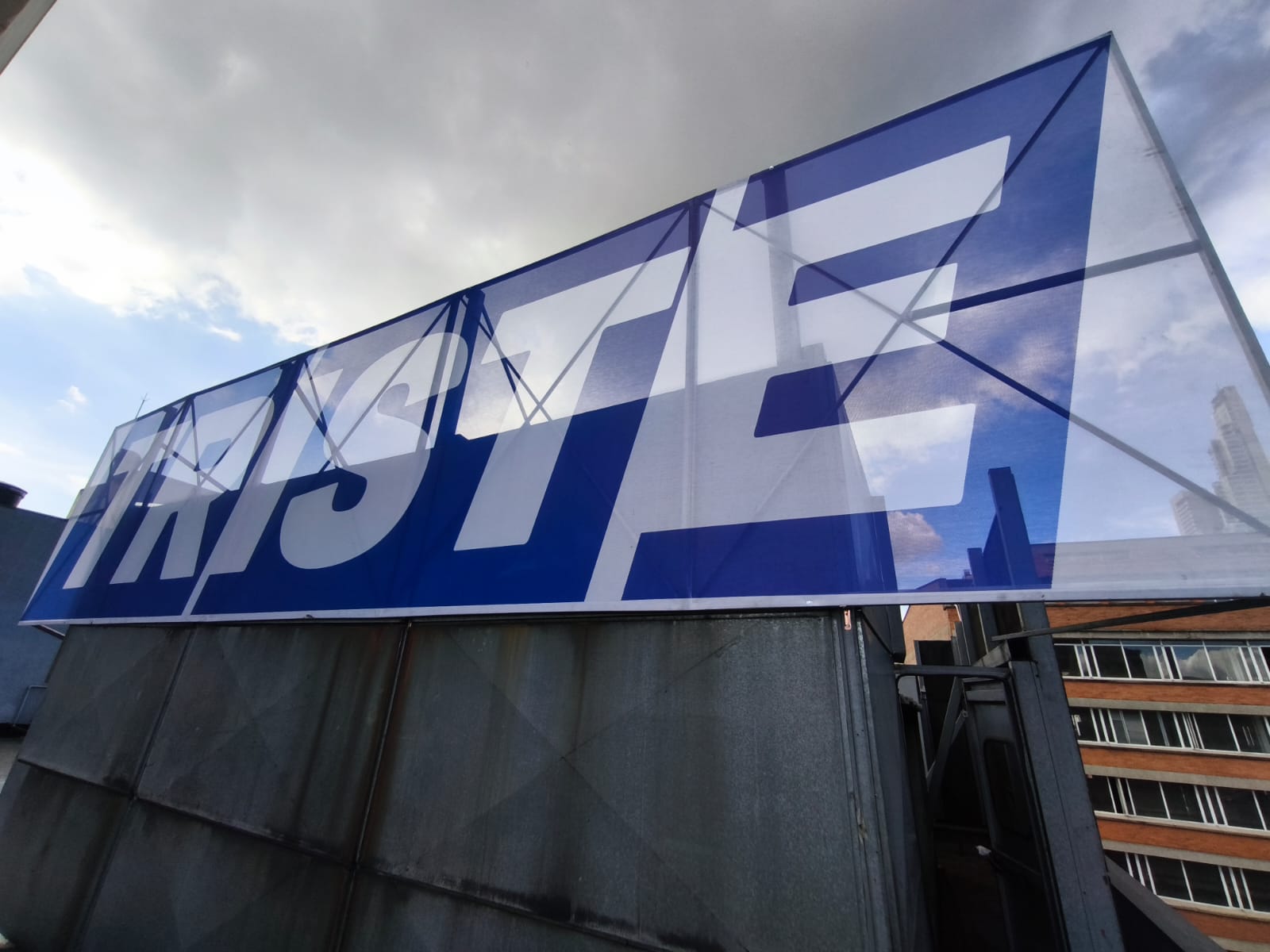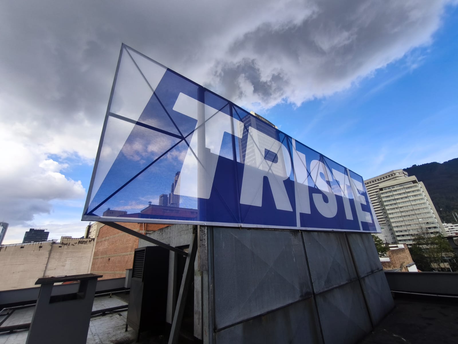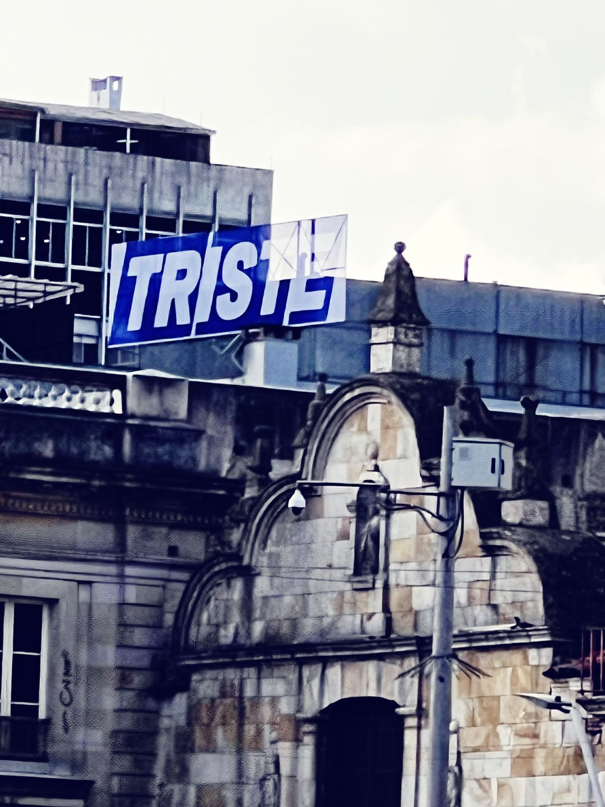 La intervención Triste ocupa el paisaje urbano con una simple declaración tipográfica. Desde lo alto de una edificación del centro histórico, la palabra se erige como una valla silenciosa que se confunde con la publicidad cotidiana, pero que detiene la mirada por su carga emocional y su austeridad formal.