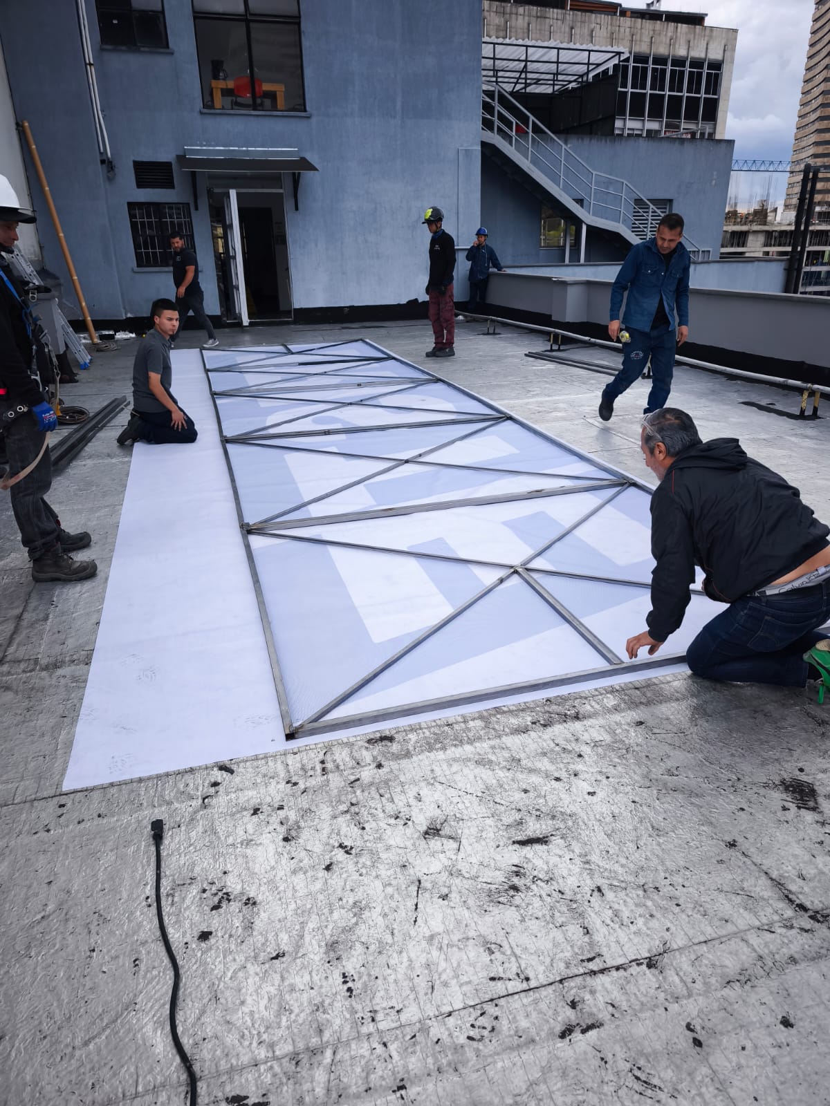 La obra se estructura mediante un bastidor metálico diseñado a medida para sostener la lona impresa. Su geometría responde a las proporciones de la fachada y al perímetro del techo donde se emplaza